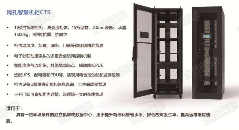 CTS系列网孔智慧机柜以智慧管理终端为核心,侧重于机柜微环境、机柜状态、机柜门禁、IT资产的管理,可视化呈现整个微型数据中心的环境数据,促进管理精细化提升,并促进数据中心的节能降耗。