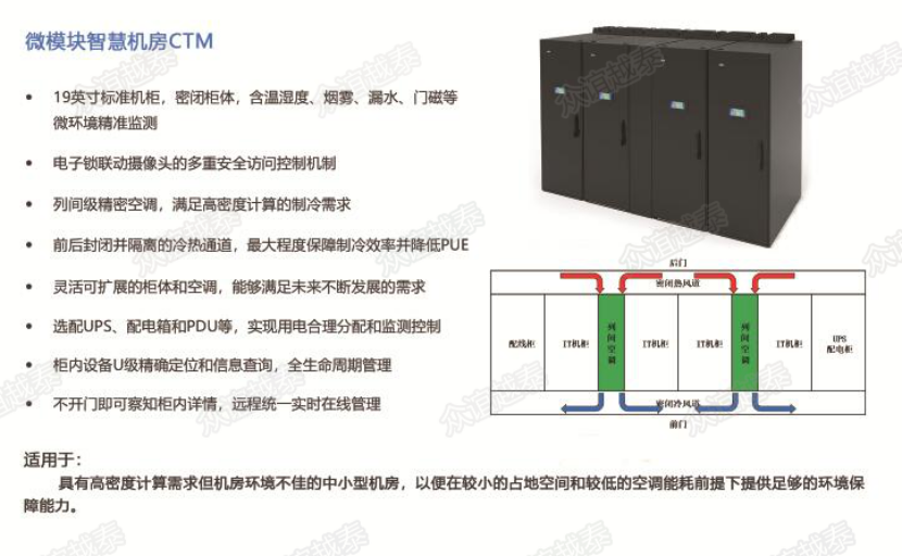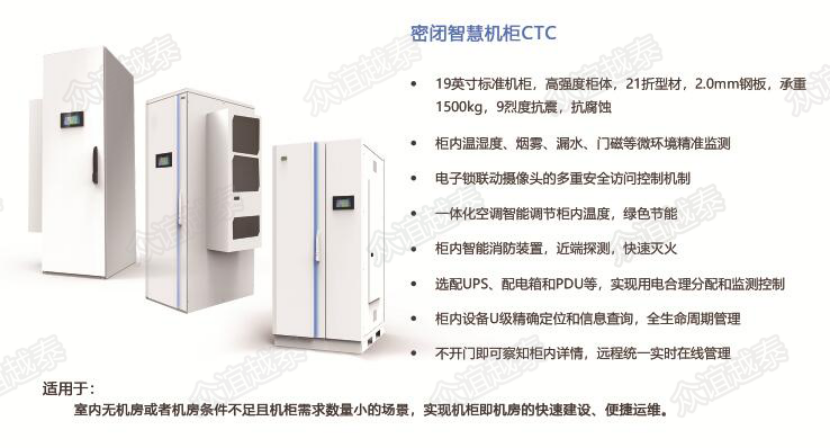 CTC系列密闭智慧机柜同样以智慧管理终端为核心,内部集成了机房所必需的配电系统、制冷系统、消防系统、门禁系统、监控系统等基础设施。CTC系列密闭智慧机柜以产品代替工程,安装简单快捷,即装即用,并将机房与环境脱离,适应多种应用场景,使用灵活,经济高效,安全可靠。