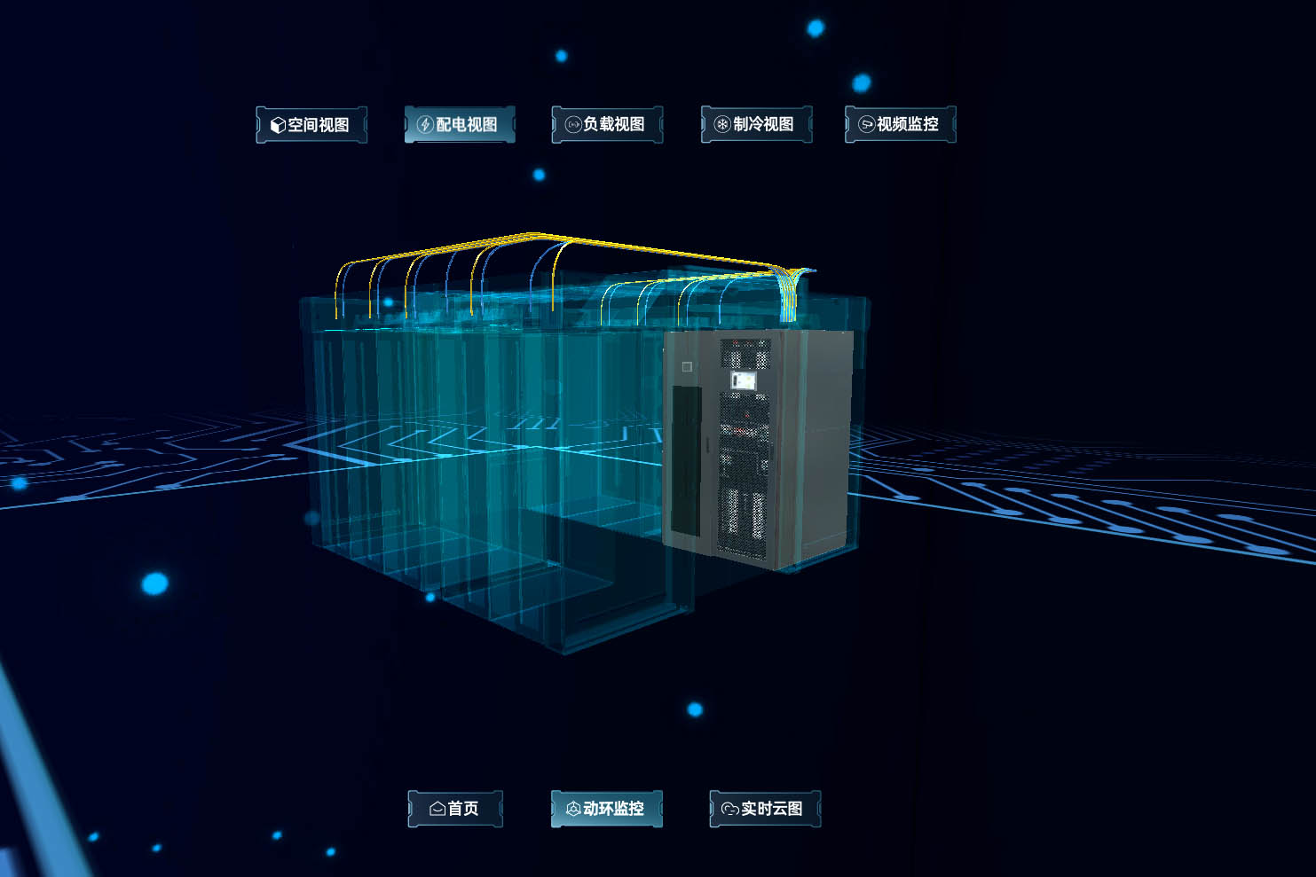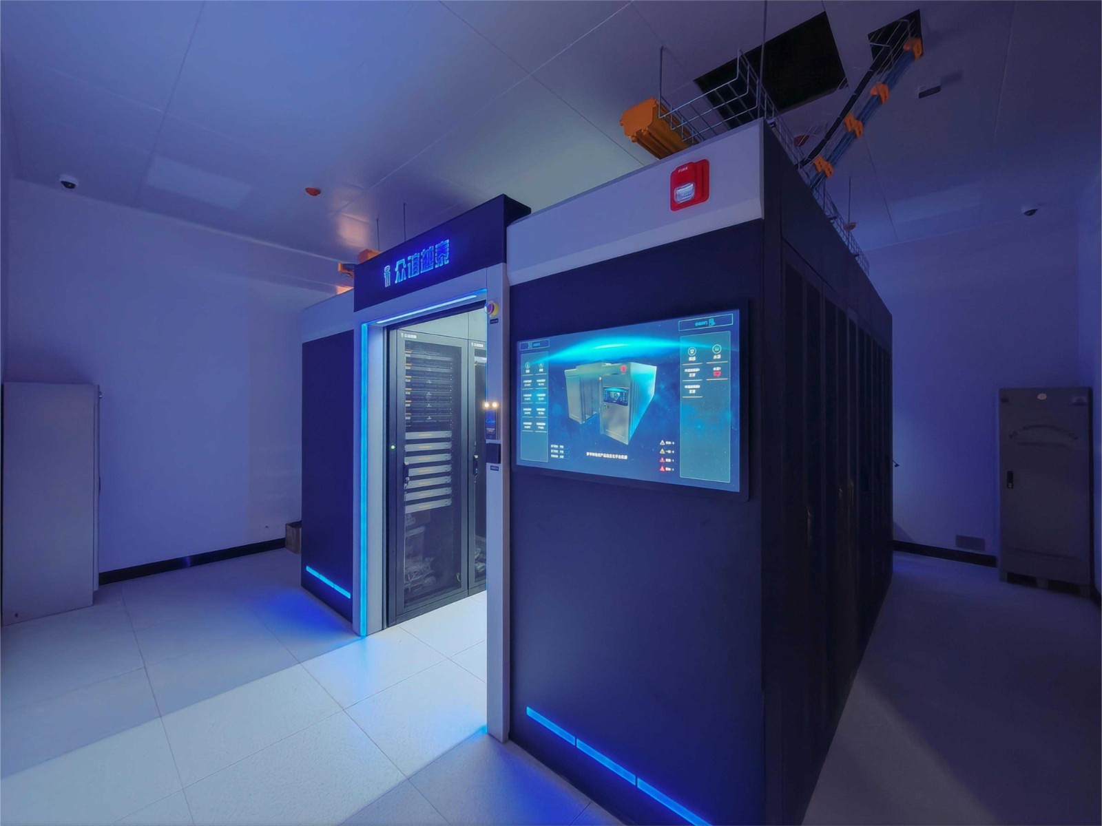 本项目机房不仅硬件采用我司CTA模块化智慧数据中心拳头产品,为满足客户以 3D可视化的方式对机房内各基础设施设备在线监控管理的需求,我司依托自主研发“3D可视化管理平台”为用户提供了定制化的开发服务,此平台主要功能模块包含温湿度云图、资产管理、能耗管理、容量资源管理等,并具有未来进一步实施其它专业可视化管理的接口扩容能力。本项目同时配备全彩LED大屏显示系统和全频阵列扩声系统,大大提高了展示时的视听效果。
