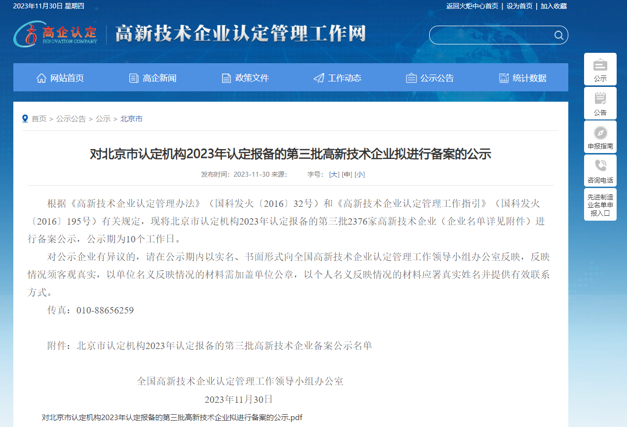 岁末年初,喜报传来。据国家高新技术企业认定管理工作网2023年11月30日发布的最新公告显示,北京众谊越泰科技有限公司再次通过国家高新技术企业认定,这标志着我司在自主知识产权、技术创新组织管理、科技成果转化能力、成长性指标等环节持续获得国家认可。