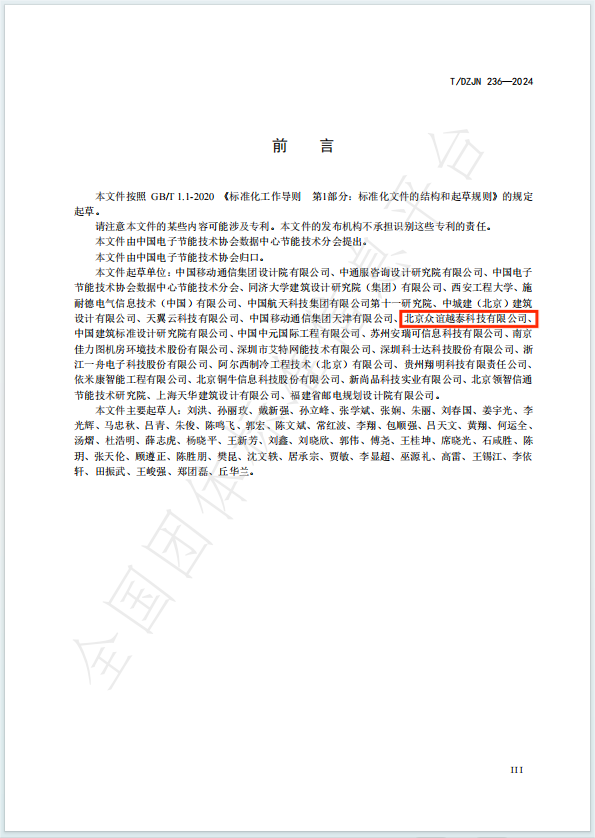 《T/DZJN 236-2024 边缘计算数据中心基础设施设计标准》由中国电子节能技术协会数据中心节能技术分会、中国移动通信集团设计院有限公司、中通服咨询设计研究院有限公司主编,众谊越泰作为重要参编单位,与来自全国产、学、研、用多方的30多名专家、学者,共同进行了该标准的起草和制定工作。